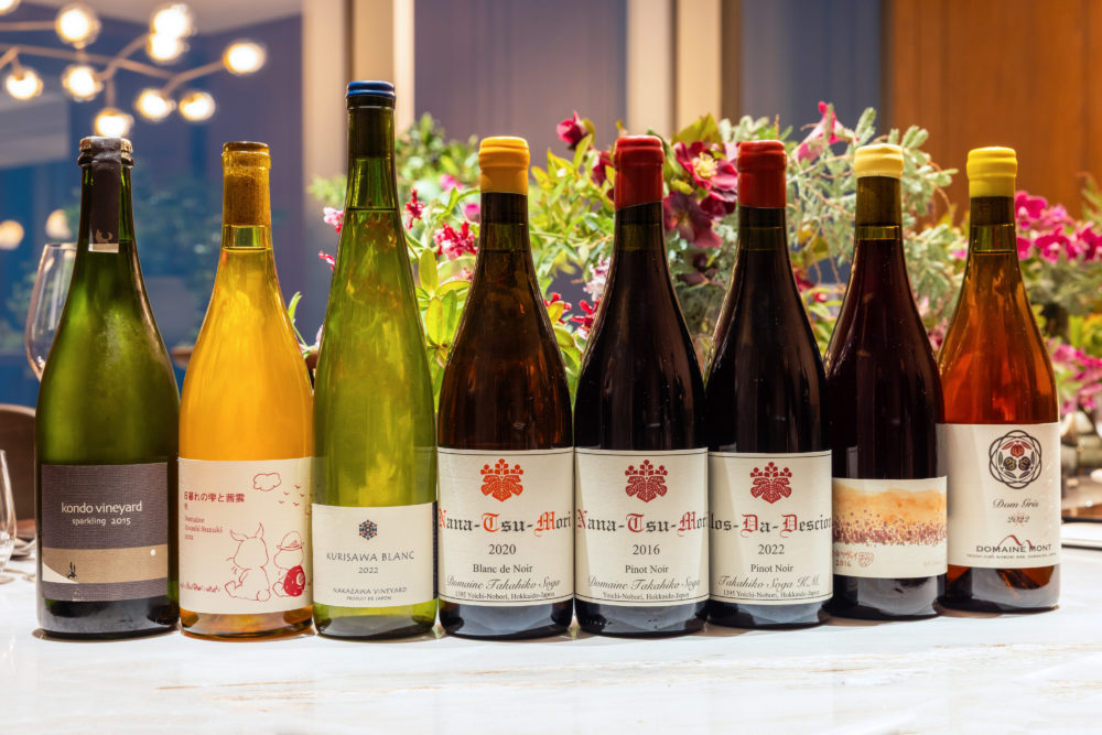 左から:KONDOヴィンヤード スパークリング 2015、ナカザワヴィンヤード クリサワブラン 2022、ドメーヌ・アツシ・スズキ 日暮の雫と茜雲 橙 2023、ドメーヌ・モン ドングリ 2022、ドメーヌ・タカヒコ ナナ・ツ・モリ ブランドノワール 2020、ドメーヌ・タカヒコ クロ・ダ・デーション 2022、10R ワイナリー KWtN 余市ツヴァイ 2016、ドメーヌ・タカヒコ ナナ・ツ・モリ2016。
