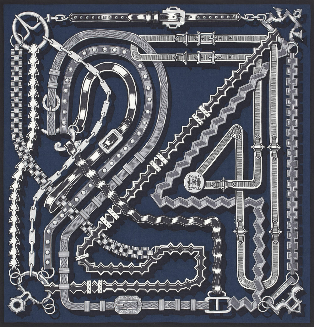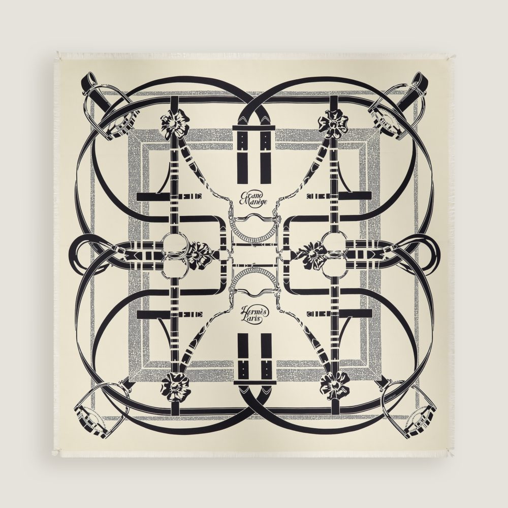 エミール・エルメス コレクションの馬具を迷宮のように並べ、「24」の文字を描き出したユニークな意匠。野村大輔作。カシミア70%+シルク30%。100×100cm。¥166,100