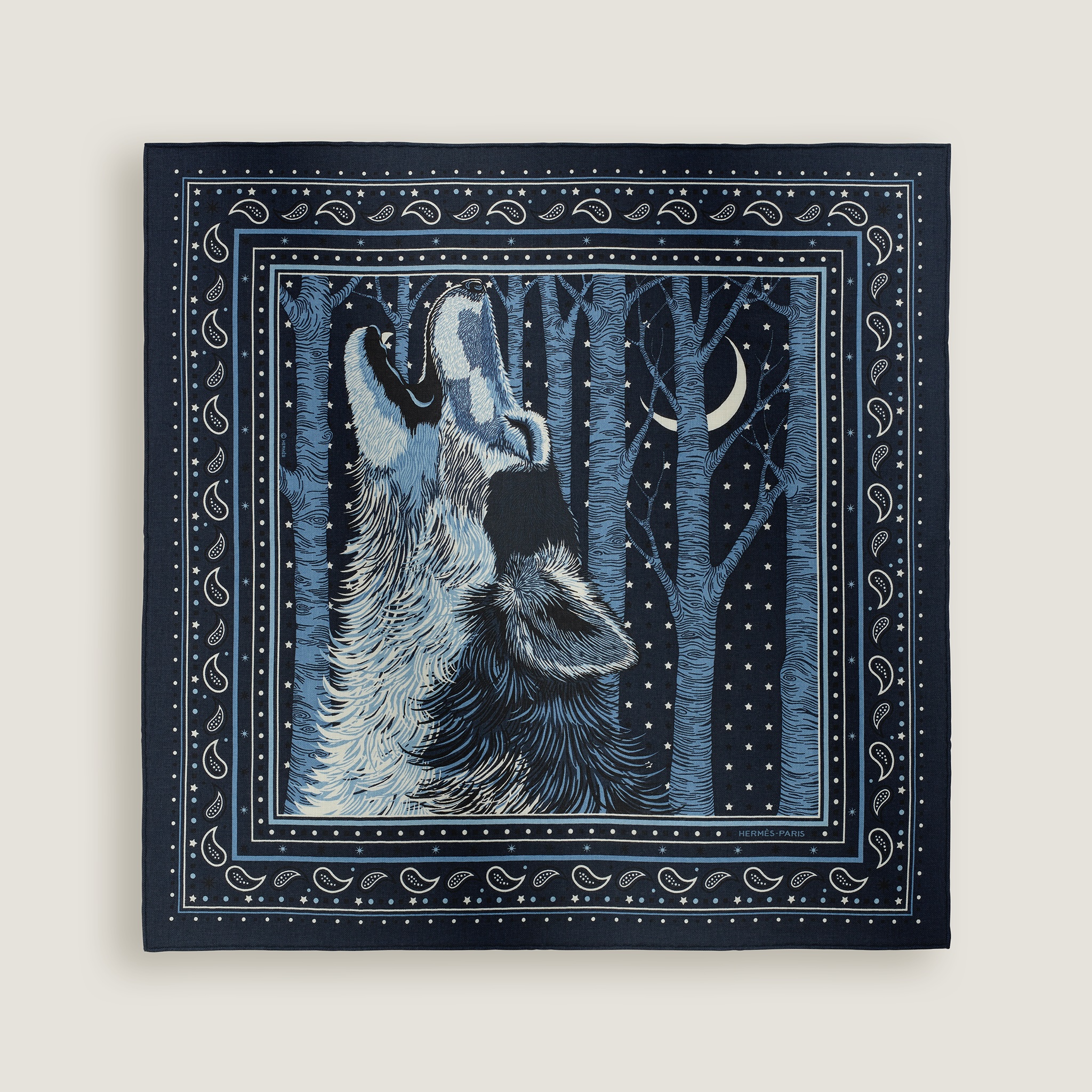 月夜の森で吠えるオオカミを活き活きとした筆致で描き出したデザインはアリス・シャーリー作。2018年秋冬が初出で、今季はバンダナ調にアレンジして登場。カシミア70%+シルク30%。65×65cm。¥81,400