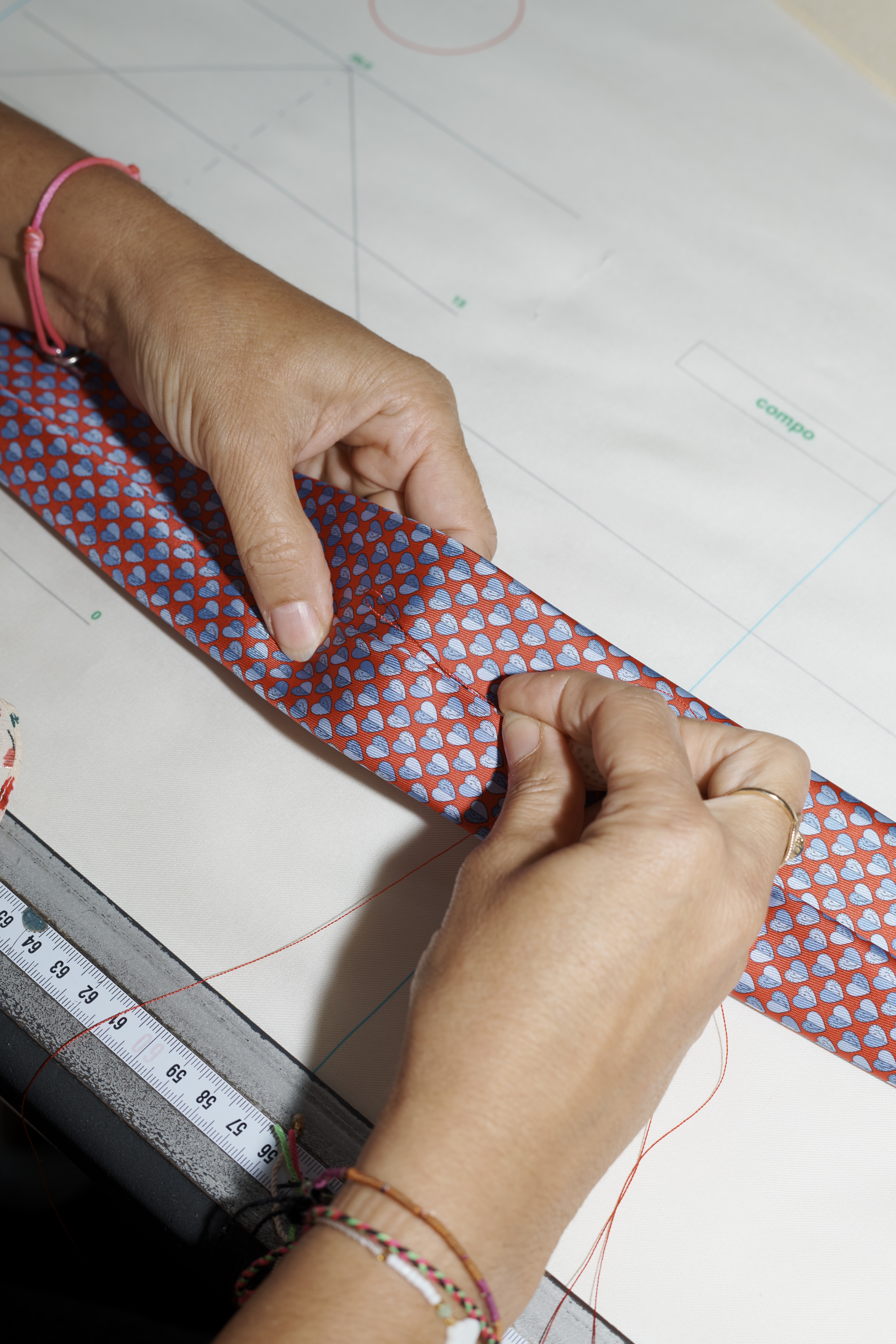 シルクアイテム製作風景の一部。すべてシルクの聖地・リヨンに構えるエルメスの自社工房で行われ、随所に職人の手仕事が介在する。モードのトレンドではなく、時代の空気感を表現することに重きを置いたコレクション。ゆえにその魅力はタイムレスな輝きを放つ。©Sophie Tajan