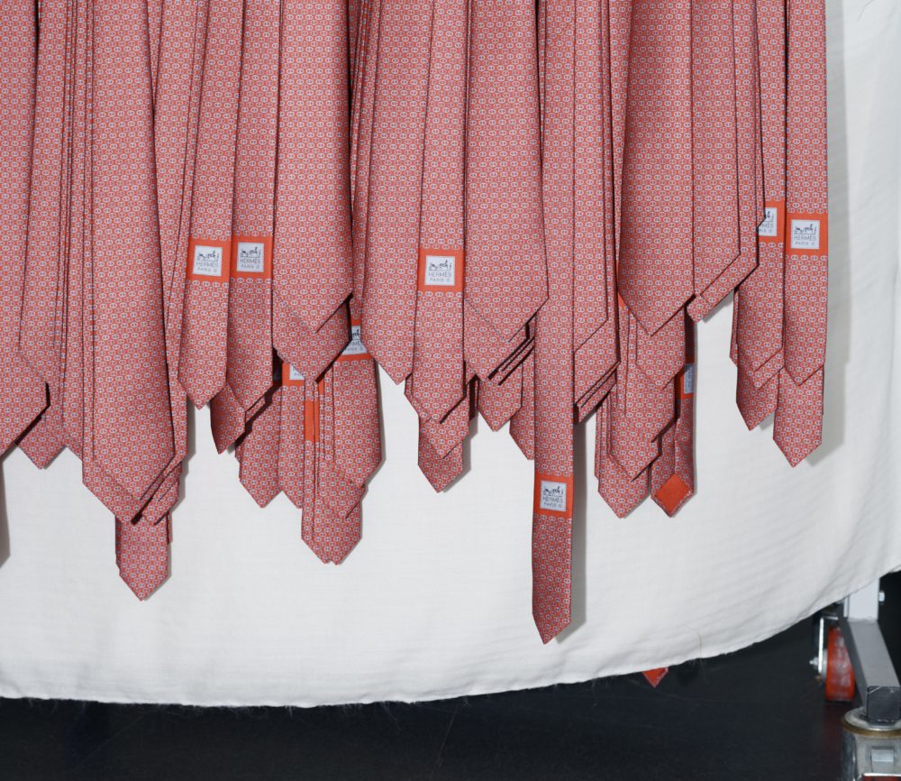 吊り下げられたネクタイの束が放つ、ほのかに浮かび上がるような光沢も絶品。©Sophie Tajan