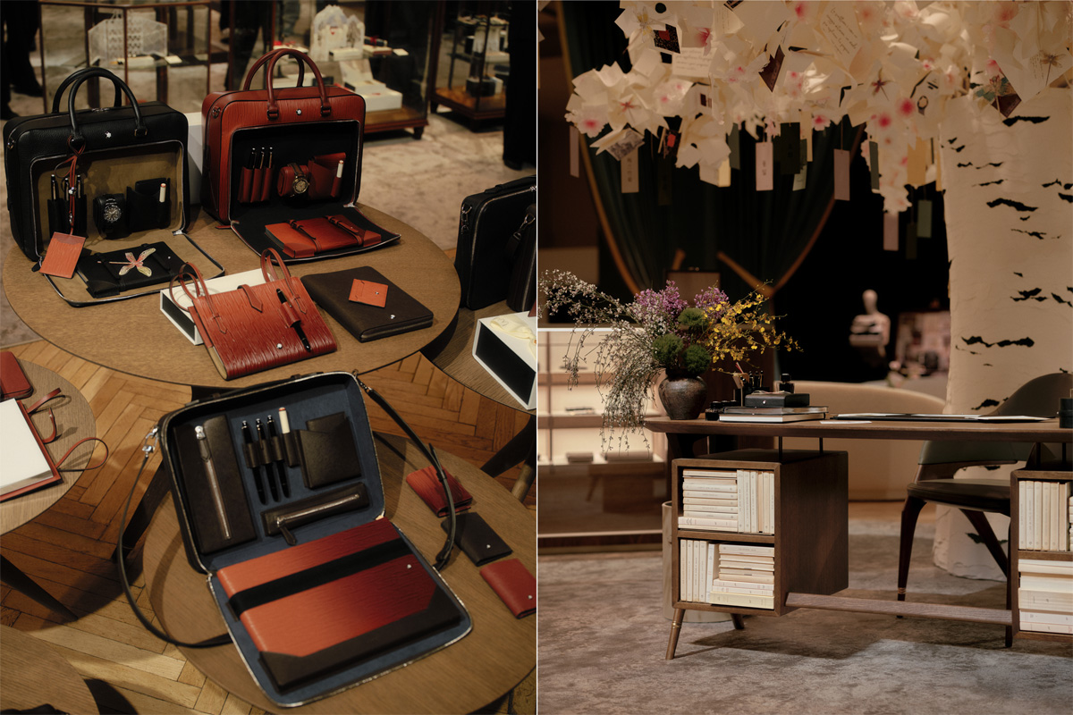ミラノメンズファッションウィーク中の展示。右:会場には「Tree of Writing」という大きな木を設置。日本語、韓国語、中国語で書かれたさまざまなメッセージが短冊のようにぶら下がる。木の下には「マイスターシュテュック」からの連想でトマセッタ氏がデザインしたモンブランデスクを展示。「読者の皆さんにぜひおすすめ」とか。左:秋冬コレクションはエボニー、レッドオーク、ハニーなどの温かみのある色揃え。