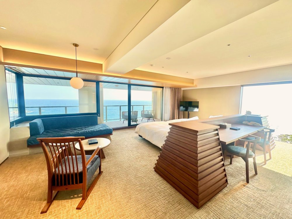 サウナ好きなら、最上階の角部屋に位置するコーナースイートルームがよいだろう。オーシャンビューの露天風呂に加え、プライベートサウナと水風呂のあるテラスを完備。源泉かけ流しの湯に浸かり、サウナで温まり、テラスで外気浴を楽しむといったように、温泉とサウナを自由に行き来しながらリトリートする体験が叶う。サウナ付きの客室にはオリジナルのサウナハットが人数分置いてあり、至れり尽くせりである。