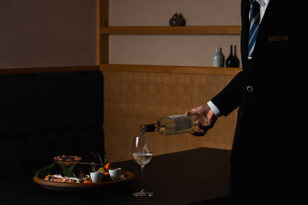 ペアリングの酒は、ソムリエが厳選したワインと地酒を和食に合わせている。