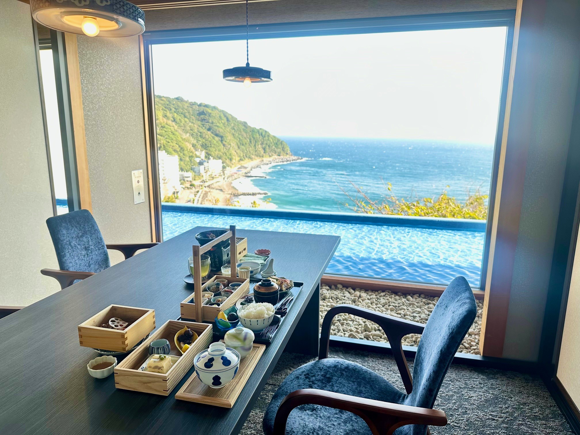 ここでの過ごし方は、到着後に街へ出ることもなく静かに温泉を楽しむのが正解。月夜を堪能して就寝した後、目覚めたらすぐさま朝風呂に入るといったように、源泉かけ流しの露天風呂はいつ浸かっても快適な状態だ。朝は真っ青な海が続く熱川の景色を眺めながら、爽快な時間を過ごすことができる。湧き出る温泉のエネルギーを享受しながら心と身体を開放し、温泉リトリートを存分に堪能したい。