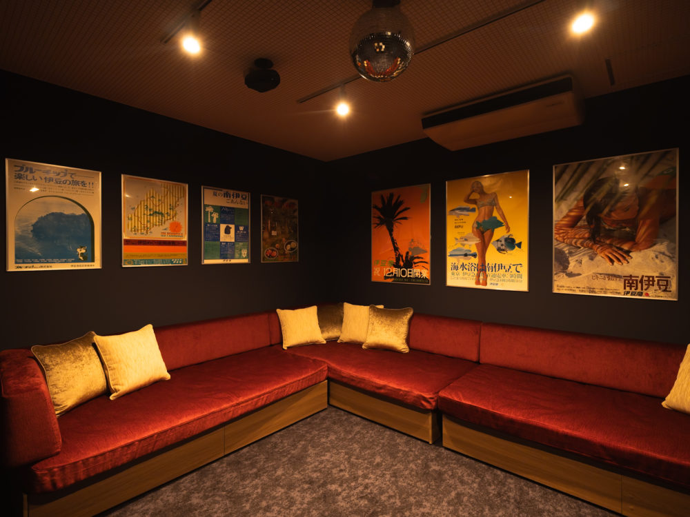 「カラオケスイート」のカラオケルーム。伊豆急行の懐かしいポスターを貼り、あえてレトロな雰囲気に仕上げている。