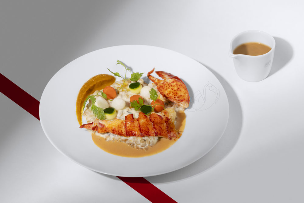 機内の設備も別格だ。ラ・プルミエールは各フライトで4席のみ。約3.5㎡の専有空間と通路を仕切るのは、天井から床までのやわらかなカーテンで、ストレージを足元に設けることで圧迫感も最小限に抑えた、心地よい空間だ。食体験もまた、ラ・プルミエールの真髄といえよう。パリ発の便では数か月ごとに変わる三つ星シェフの料理が提供され、日本発便では銀座「ロオジエ」のオリヴィエ・シェニョン氏が監修したメニューが並ぶ。厳選されたシャンパーニュやワインが料理を引き立て、ジャン・マリー・マッソー氏が監修した上質なテーブルウェアが品格を添える。その本格的なガストロノミーはもはや空の上の一流フレンチダイニングだ。