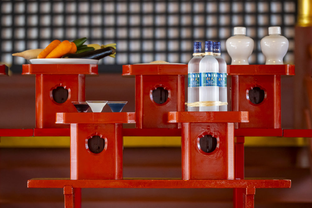 店内は高い天井に、中国の伝統的な薬局を思わせる引き出しが壁一面を覆っている一方で、モダンなアートピースも優雅に空間を彩っている。