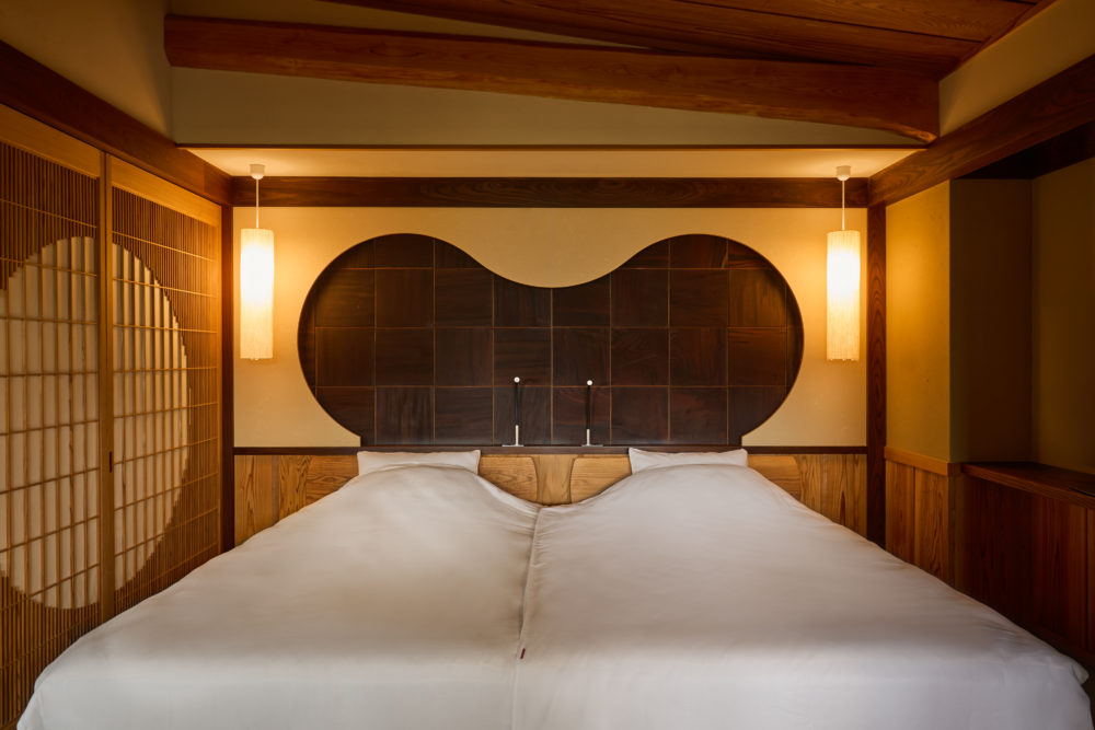 左:全室に京都の老舗寝具メーカー「IWATA」の「人類進化ベッド」を完備。右:部屋食に最適なダイニングテーブルも備わっている客室も。