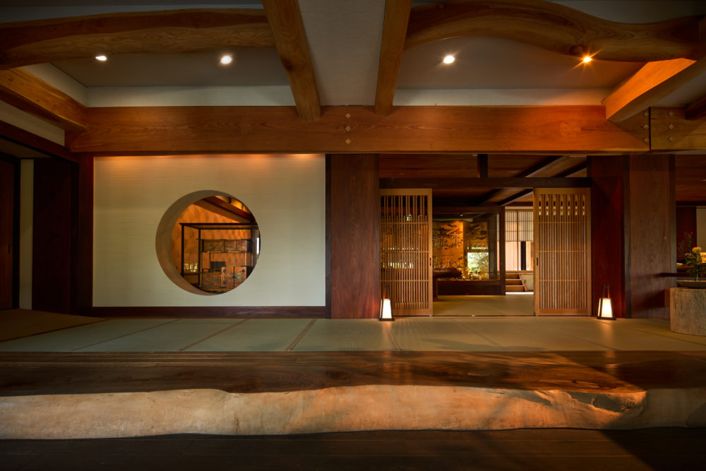 今日の目的地は、箱根強羅の温泉宿「円かの杜(まどかのもり)」。強羅駅から箱根ロープーウェーで少し登ったところにある人気宿「強羅花扇」の姉妹館だ。円かの杜が開業したのは、2014年12月のこと。円を人とのご縁とかけて、訪れたゲストが丸く満ち足りた気分で宿を後にしてほしいという想いからこの名前が名付けられた。丸い窓や球体の照明、エントランスの水車など、館内のモチーフからはその想いが随所に感じられる。