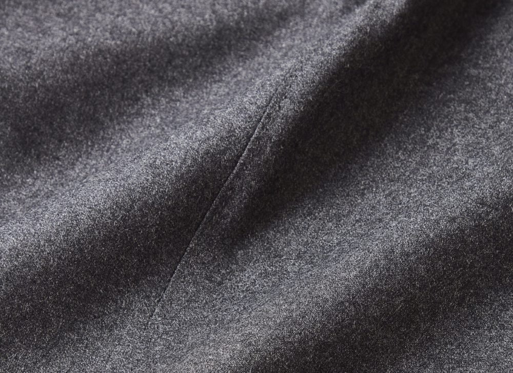 イタリアの名門ヴィターレ・バルベリス・カノニコ社が誇る21マイクロンウールで織られたサキソニー生地が、ハリとコシに優れ、美しいドレープを備えているのも高いポイントだ。平尻の日本人がインポートブランドのトラウザーズを穿いた際に起こりがちな小股のもたつきも解消している。The fabric is a saxony cloth woven from 21-micron wool by the renowned Vitale Barberis Canonico, offering both firmness and resilience, along with a graceful drape. The issue of excess fullness at the front, often experienced by Japanese wearers when choosing imported trousers, is effectively resolved here. ¥55,000 Massimo Corrado / Beams F