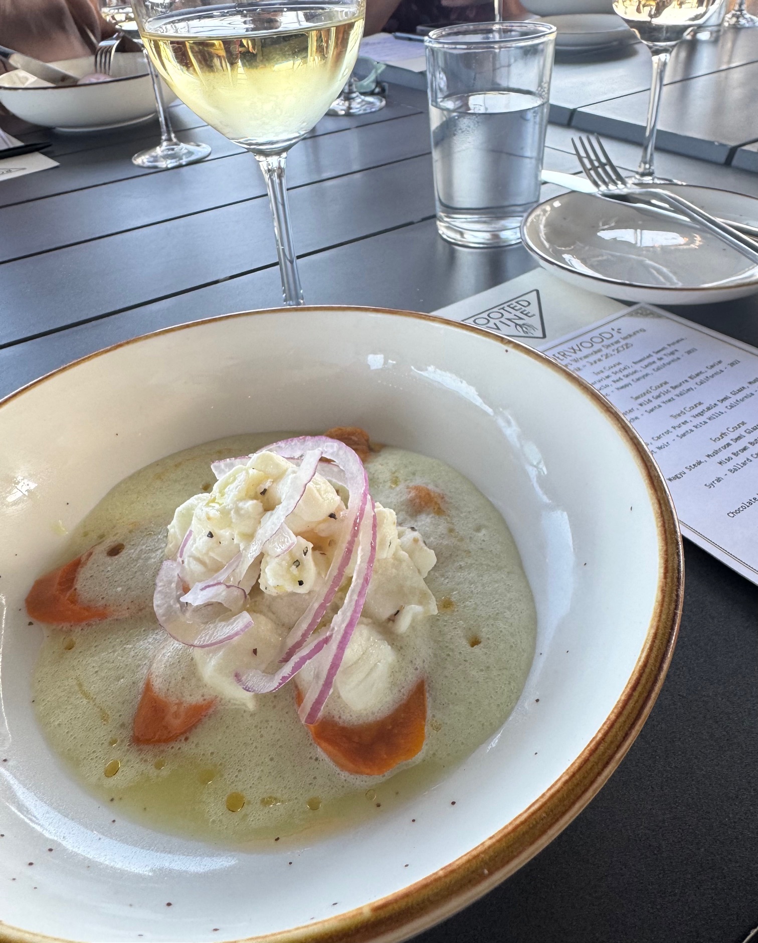 屋外には温水プール、そしてオリジナルカクテルが評判の屋上バー&レストラン「エルダーウッド」はローカルからもツーリストからも大人気のファインダイニング。シエラネバダ山脈とバイセリアの景色を一望でき、中央カリフォルニアの豊かな農産物を活かした独創的な料理が楽しめる。カリフォルニアワインのペアリングでいただいたディナーは、ローストスイートポテトや赤玉ねぎ、チョクロという白い大粒のとうもろこしと一緒にいただく前菜のオヒョウのセビーチェ、メインのA5ランクの和牛ステーキ・マッシュルームのデミグラスソースにポレンタ、味噌ブラウンバターエスプーマが秀逸だった。