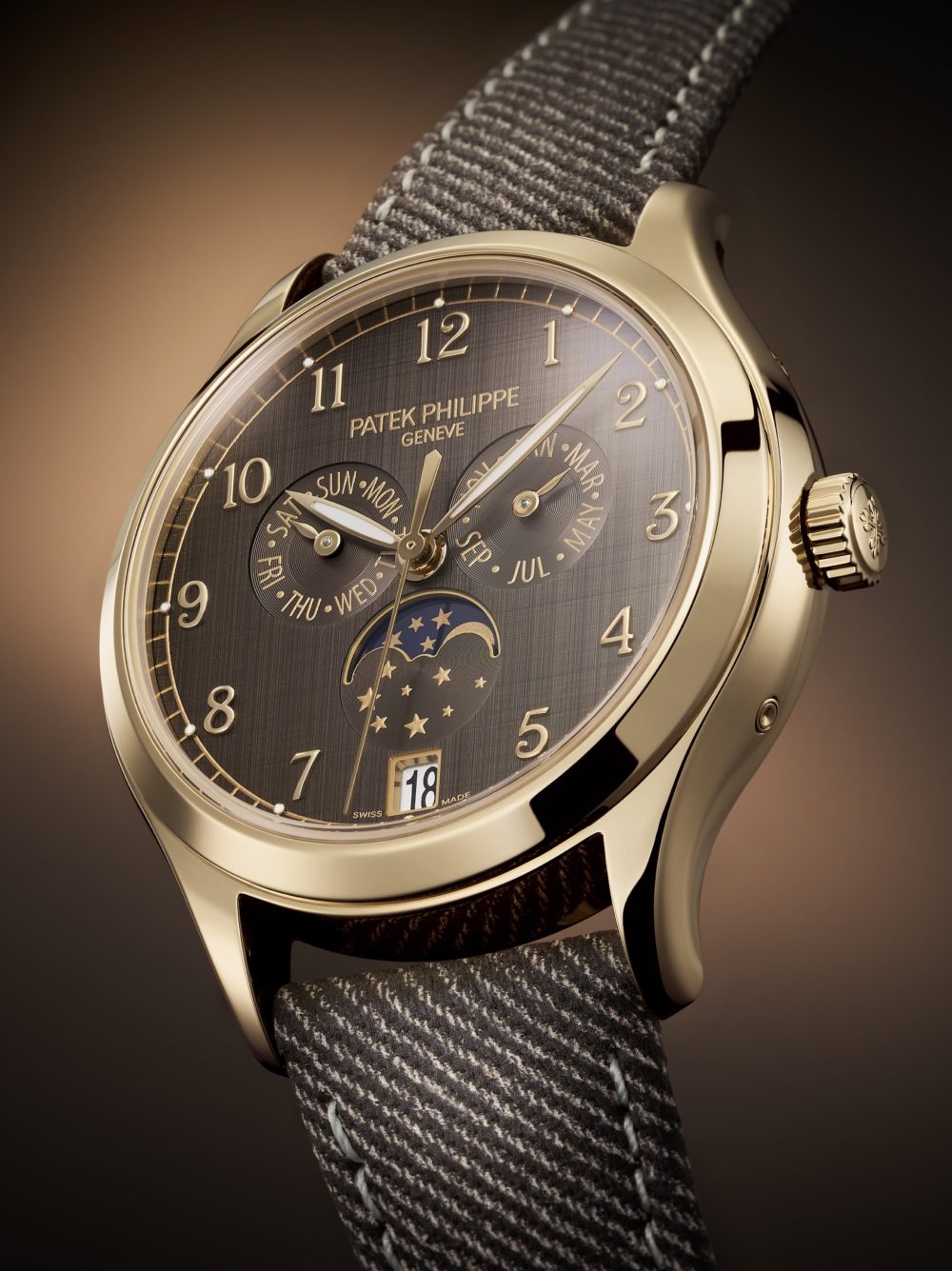 これまではマザーオブパールやダイヤモンドの輝き、そしてピンクやライトブルーなどの鮮やかなカラーリングで魅了してきたが、最新作は一転して、ローズゴールドの純粋な艶めきが見事な、チェストナットカラー文字盤のモデルが登場した。今年は同様にレディス向けコレクションの「Twenty~4」にもダイヤモンドセッティングのない初の永 久カレンダーが加わっている。あえてダイヤモンドを施さないという、レディスモデルでは珍しいスタイルが導き出したのは、新時代の“洗練”の形。時計業界ではここ数年、サイズアップをはじめとするジェンダーレス化の傾 向が見られるが、このモデルにおいては、宝石の輝きに頼らないことで際立たせたポリッシュ仕上げのゴールドと、山東絹仕上げと呼ばれる絹織物のように味わい深い文字盤、そしてカジュアルな遊び心を感じさせるデニム柄カーフスキンストラップ―すべてが現代的なバランスで集約されている。どこよりも早く複雑機構搭載のレディスモデルを展開し、現代を生きる女性たちの声に耳を傾けてきたパテック フィリップだからこその感性が光っている。