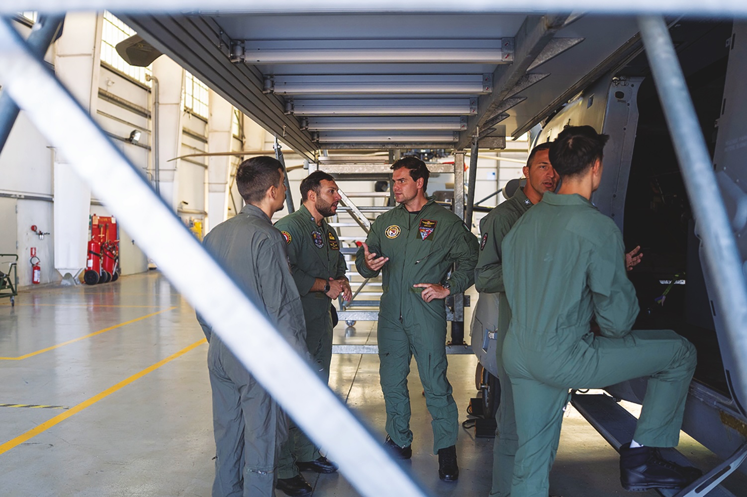 だが訓練はさらに激しさを増す。暗視ゴーグルの訓練、ヘリコプター整備の実習、戦闘機シミュレーション。そしてクライマックスは、海上救出訓練。我々は海に投下され、負傷者救助と同じ手順でヘリに引き上げられる予定だった。ところが、初回のグループの訓練でヘリのウインチが故障した。地中海に浮かぶ参加者たちを想像して笑ってしまった─パネライを腕に巻いた彼らが、ヘリが引き返すのを愕然として見守る姿を。しかしその時、はっと気づいた。これは想像なのではない、リアルなのだ。我々はまさに実践の真っ只中にいるのだと。