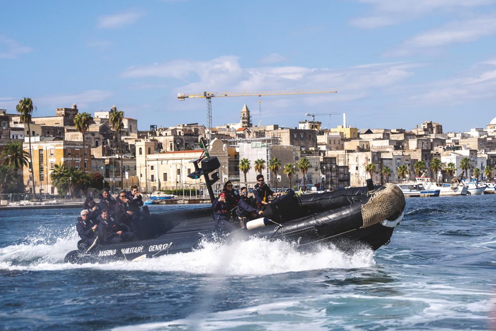 冒険は早朝5時に始まった。前夜にホテルのベッドに用意されていた制服を頭からつま先まで身に纏い、一同は戦争映画さながらの軍用バスに乗り込んだ。1時間ほどかけて到着した海軍埠頭には、世界各国の軍艦が並び、その中に我々の拠点となる艦艇「ナヴァーレ・カラビニエリ」が停泊していた。最も印象的だったのは、参加者全員がこの体験をいかに真剣に受け止めていたかということだ。もちろん、国旗掲揚式は写真撮影のための演出ではない。我々もきちんと整列し、艦長に敬礼し、日常の軍儀式に加わることになった。そこにいたのはイベントスタッフではなく、前例のない形で招いてくれた、本物の海軍関係者たちだった。
