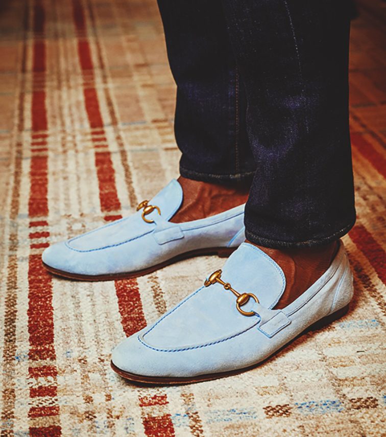 ブルーのスエードホースビットローファーにデニム。カラーの観点からも、そしてロックンロールの精神からも、このジャケットを引き立てる欠かせないアイテムだ。Blue suede horsebit loafers and jeans — essentials that complement the jacket from both a colour perspective and a rock ’n’ roll one.