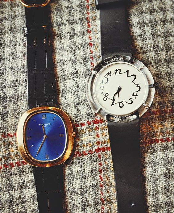 〈パテック フィリップ ゴールデン・エリプス〉は、イーブスにとっての“ミーティングウォッチ”だ。エグゼクティブな場面で威厳を添えてくれる存在である。一方、〈JAR〉の時計は遊び心があり控えめで、どんな装いにも自在に合わせることができる。This Patek Philippe Golden Ellipse is Ebs’ ‘meeting watch.’ It lends authority in executive settings. Fun and unassuming, he can wear the JAR watch with almost any outfit.