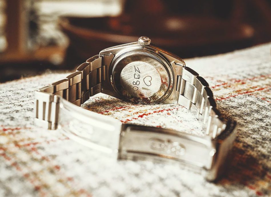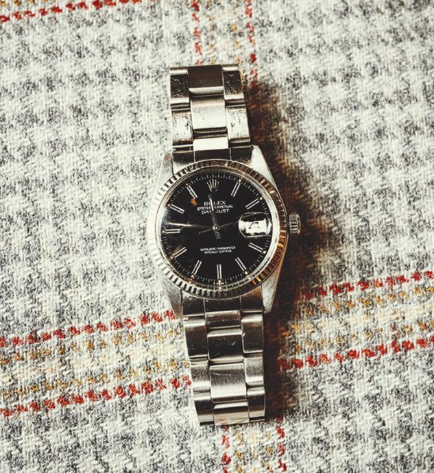 〈ロレックス デイトジャスト〉は、イーブスの生まれ年に合わせ、裏蓋にハートを刻んだバースデーギフトだ。「時計が大好きなんです」と彼は語る。時計は彼にスタイルの感覚を与え、そして自身の姿勢をも表現する。A Rolex Datejust, a birthday gift with Ebs’ birth year and a heart engraved on the back. ‘I love watches,’ he says. Watches give him a sense of style and his sense of attitude.