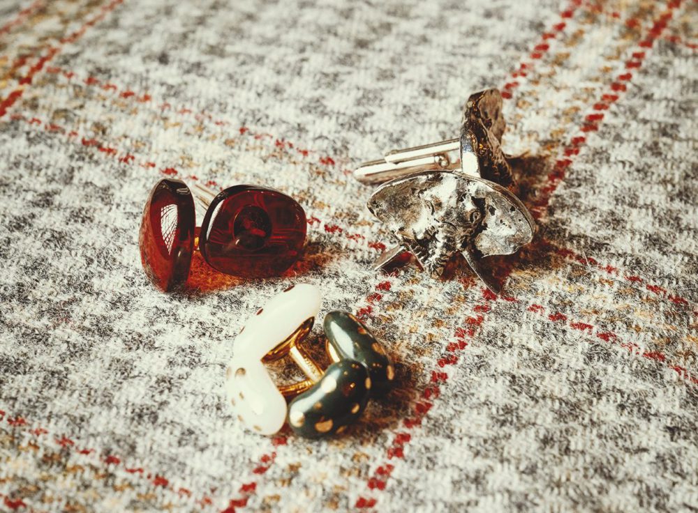 イーブスは、自らの「カフリンクス好き」を隠そうとはしない。琥珀のカフリンクスは、夫ピエール・ラグランジュと訪れたパリのヴィンテージショップで出会った逸品。象をかたどった一対は、彼が初めて南アフリカを旅した際、ケープタウンで手に入れた思い出の品だ。そして〈タフィン〉のカフリンクスは、記念日に贈られた特別なギフトである。Ebs freely admits his weakness for cufflinks. He found the amber cufflinks in a vintage shop in Paris with his husband, Pierre Lagrange. The elephant pieces came from Cape Town, during his first trip to South Africa. The Taffin cufflinks were an anniversary gift.