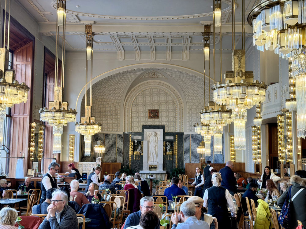 さらに街歩きの途中で立ち寄った「市民会館」も印象的だった。アール・ヌーヴォーの粋を集めたこの建築は、1918年のチェコスロバキア独立宣言が行われた歴史的舞台でもある。ミュシャをはじめとするチェコ芸術家たちが手がけた壁画や装飾が、この国の誇りを今に伝えていた。2階にはコンサートホールがあり、毎年「プラハの春」と呼ばれる国際音楽祭が開催される。1階と地下には格式あるレストランやカフェ、ビアホールがあり、昼も夜も賑わっている。プラハの歴史と文化を感じられる象徴的な場所だった。