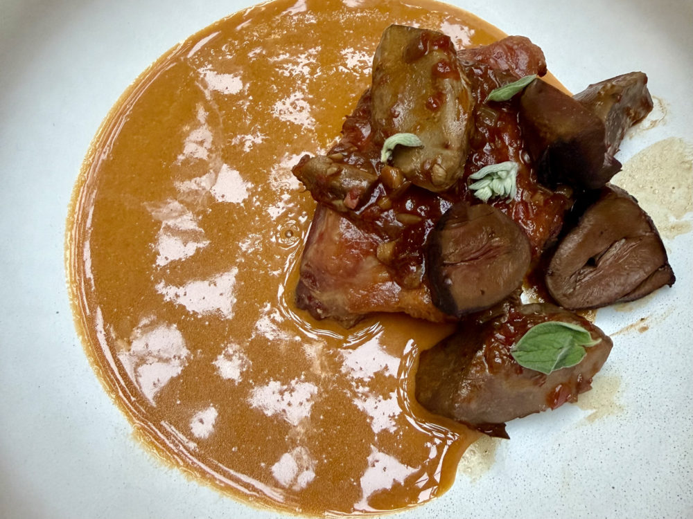 メインディッシュはガチョウのレッグとレバーのグリルにパプリカシュソースを添えて。