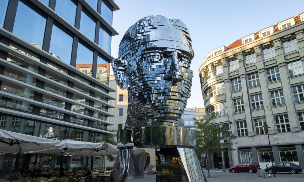 カフカの顔のオブジェ。パーツがバラバラに動いて首が回るのだが、夜はライトアップされてさらにシュール。