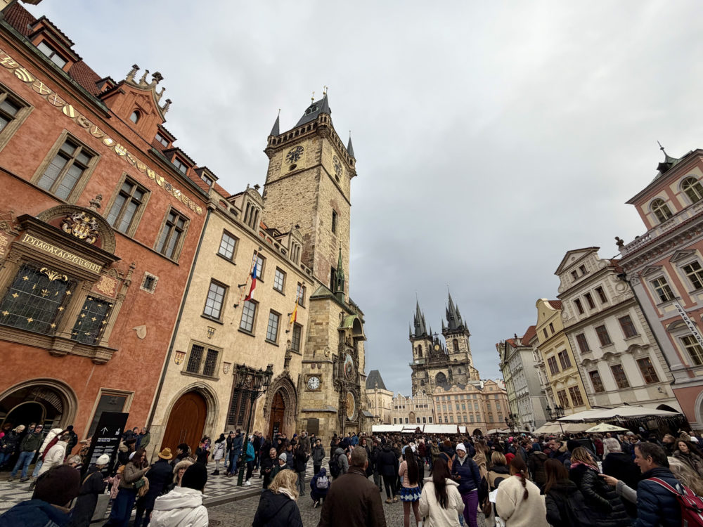 左が旧市庁舎。塔の下に天文時計があり、広場は正時が来るのを待つ観光客で埋め尽くされる。