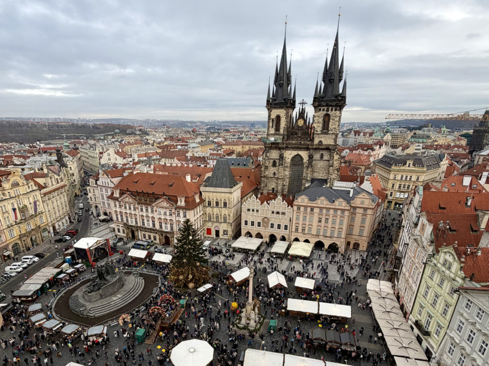 旧市庁舎の塔の上から。プラハのランドマークであるティーン教会と、旧市街広場のクリスマスマーケットの賑わいが望めた。