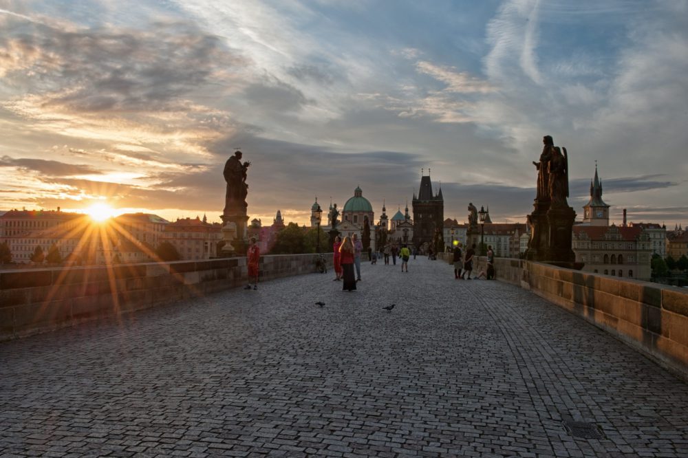 プラハ観光の目玉のひとつ、カレル橋。両サイドに聖人の彫刻が並ぶ。絵描きやジャズ・ミュージシャンの演奏などでも賑わう。