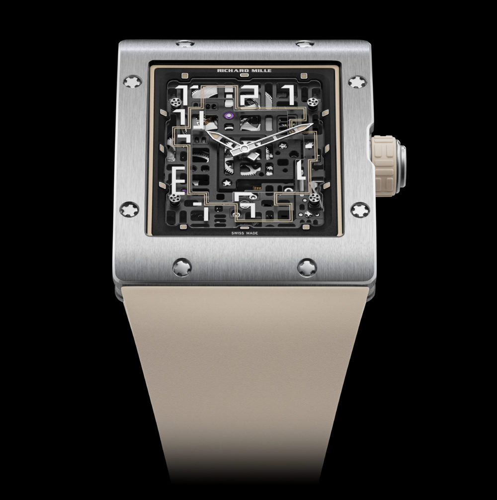ブルータリズム建築の影響を受けた洗練されたデザインだが、高耐久・超軽量のグレード5チタン製ケースモデルは、クリームホワイトカラーのストラップと相まってやわらかな印象だ。自動巻き、Tiケース、縦45.64mm×横36.00mm。価格は要問い合わせ。Richard Mille