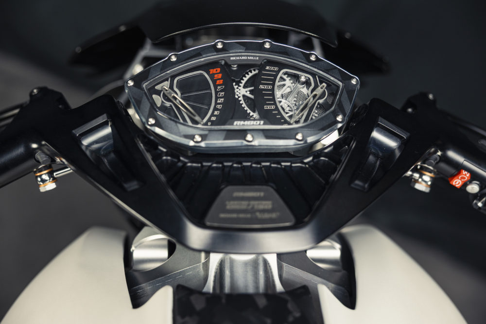 細部を注視すれば、その完成度はさらに際立つ。リシャール・ミルが手掛けた完全機械式メーター、クッションレザーの上に編み込みレザーを重ねたシート、そしてタンクを包み込みながら美しいVツインを露わにするカーボンフレーム。これらは機能以上に、バイクを“特別な存在”へと昇華させる装飾だ。