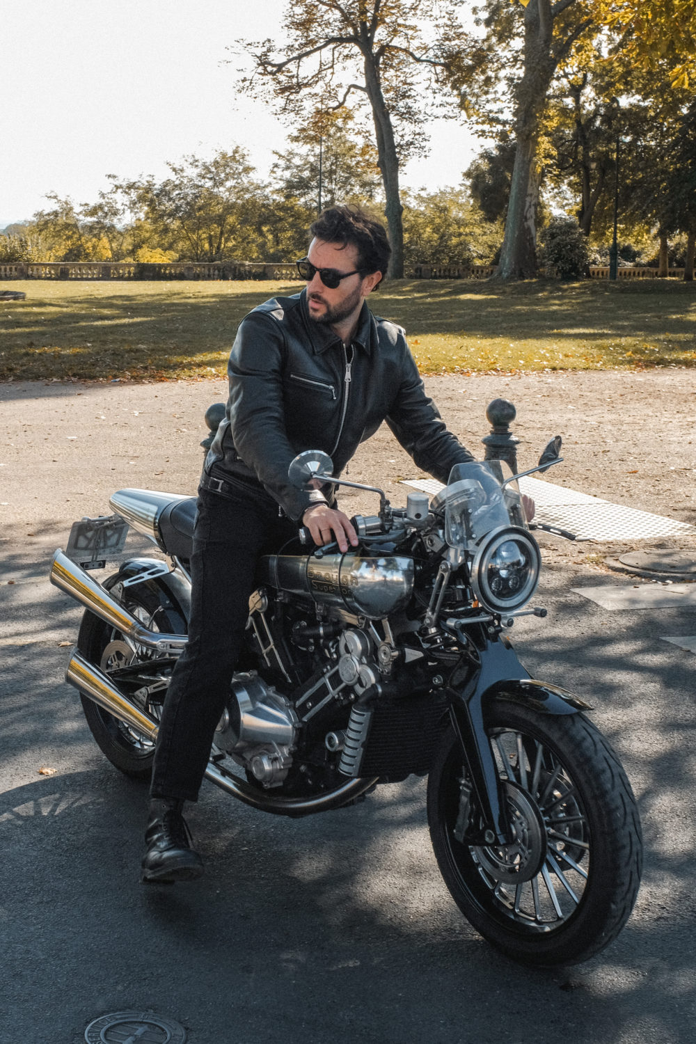 私自身は、ブラフ シューペリアの“造形美”に特に魅せられている。ヴィンテージ・テイストを称えるため、ゴールドトップの1959レザージャケット、ヴィンテージ・リーバイス、ソロヴェアのブーツを身にまとい、バイクとの世界観を合わせてみた。