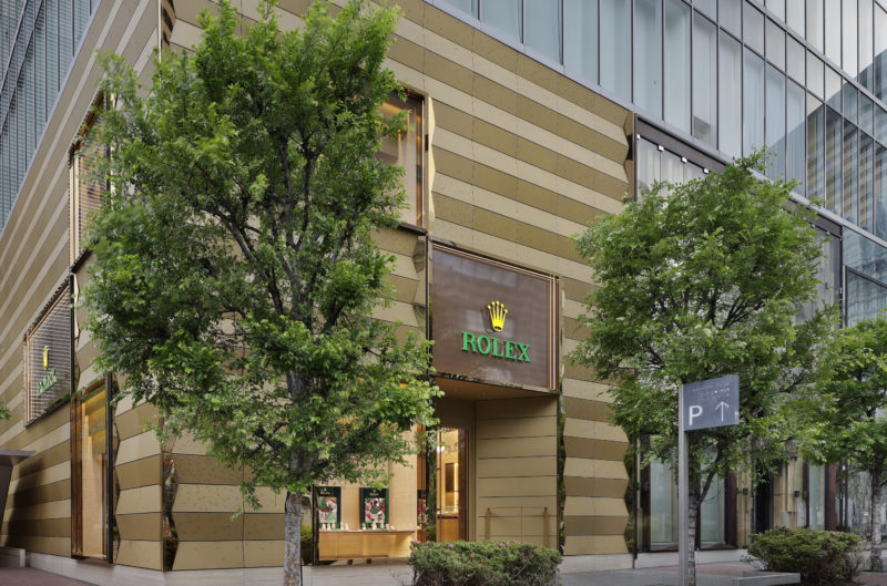 ベゼルのパターンが施されたファサードが印象的な「ロレックス ブティック 表参道」。