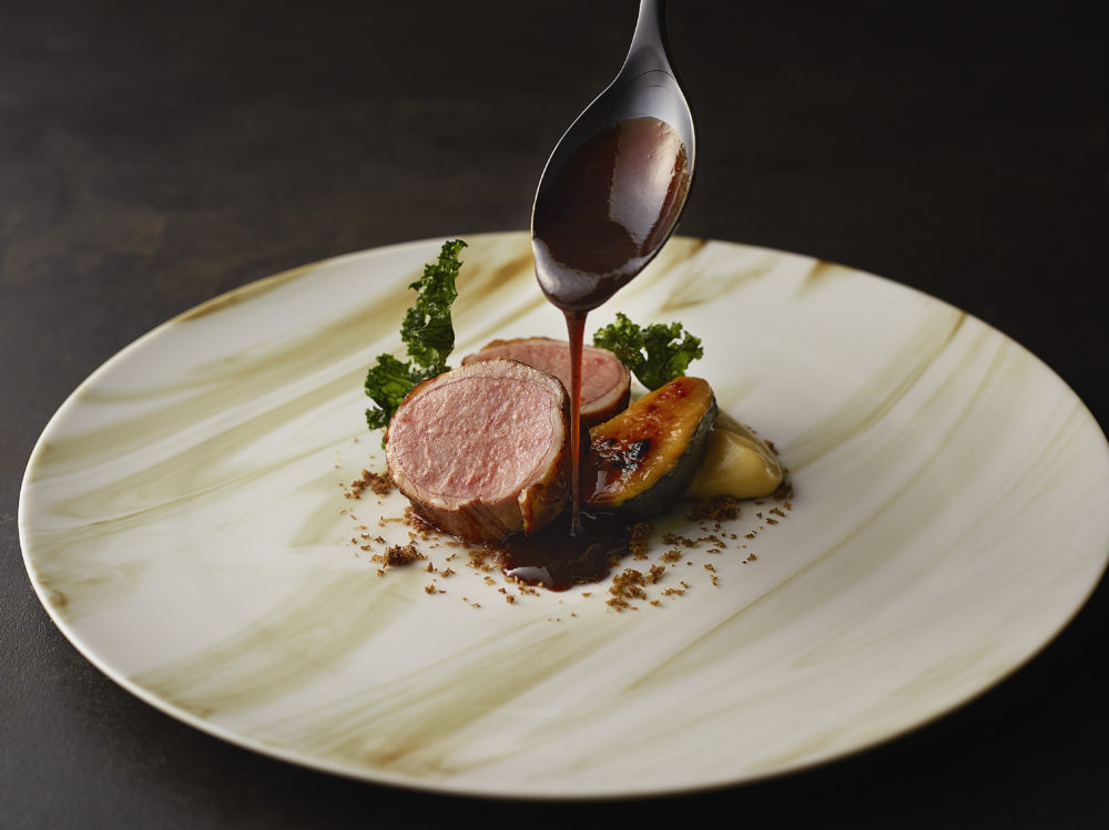 ソムリエによるペアリングも興味深い。ウェルカムドリンクのマセラードは、ハイビスカスとブラックベリー、ジュニパーベリー、黒コショウやシナモンといったスパイスを二晩かけてゆっくりと味を引き出してからサーブ。前菜に長期熟成本醸造酒「濃熟オールド」を合わせ、魚料理には爽やかさと複雑さを兼ね備えた「シャトー・ド・プレザンス ランジュー・ブラン 2022年」、肉料理にはフレンチオークで1年ほど熟成させてから瓶の中で1年熟成させた見事なバランスの赤のヴィンテージ「エル・アンデン・デ・ラ・エスタシオン・ムガ 2019」などが登場した。