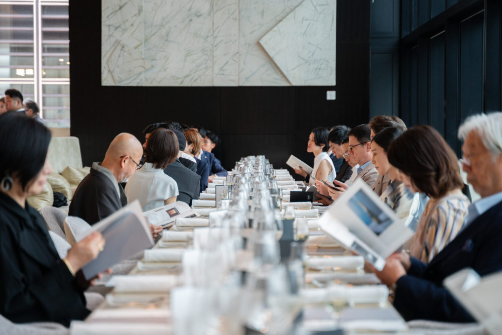 新作の発表会場となった「ベージュ アラン・デュカス 東京」。今年総料理長に就任した上野 宗士氏による極上の料理とのペアリングも披露された。