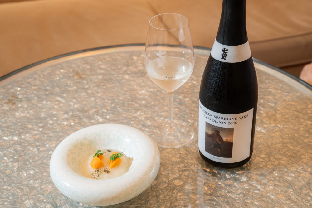 山梨銘醸・七賢が白州の地から生み出した自由な表現の熟成スパークリング日本酒「EXPRESSION」は、造り手が持つ最大限の技術と経験を注ぎ込み、芸術と融合させたシリーズ。代々受け継がれてきた蔵の財産ともいえる純米大吟醸古酒をベースとしており、長期熟成ならではの奥深い複雑性と古酒を用いた唯一無二の味わいを実現している。