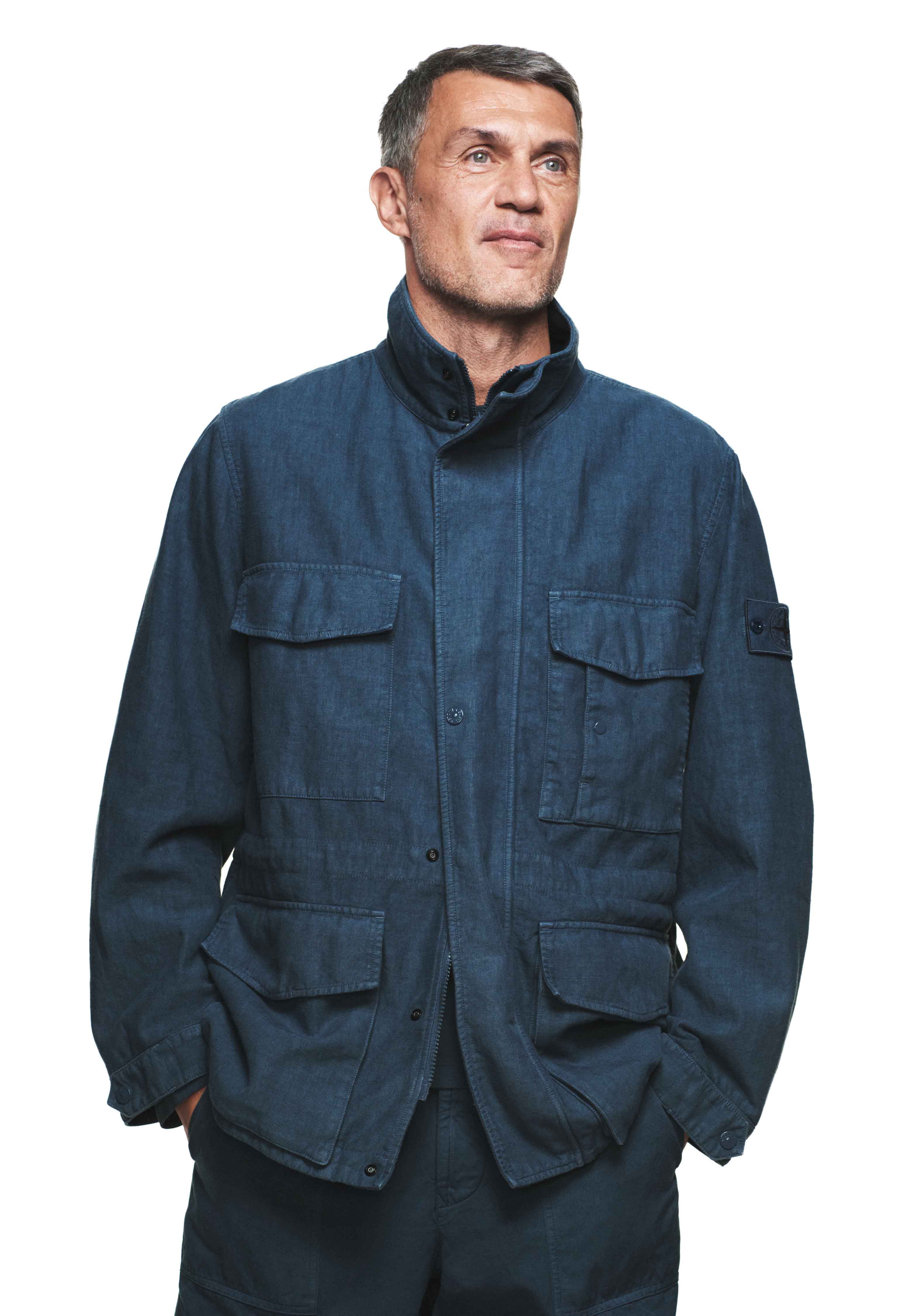 本作はダブルダイによるガーメントダイを採用。染色時に特殊な溶剤を加えて撥水性を付与し、奥行きのあるブルーとムラ感が唯一無二の表情を作り出している。リネンの裏にコットンジャージーを貼り合わせたボンディング仕様で、軽さの中にも上着としての立体感がしっかりあるのがいい。ビジュアルに登場するのは、ACミランの象徴であり続けるパオロ・マルディーニ氏。派手さよりも品格で勝つ彼の佇まいが、服の方向性を端的に示している。大人がさらりと着て成立する一着なのだ。