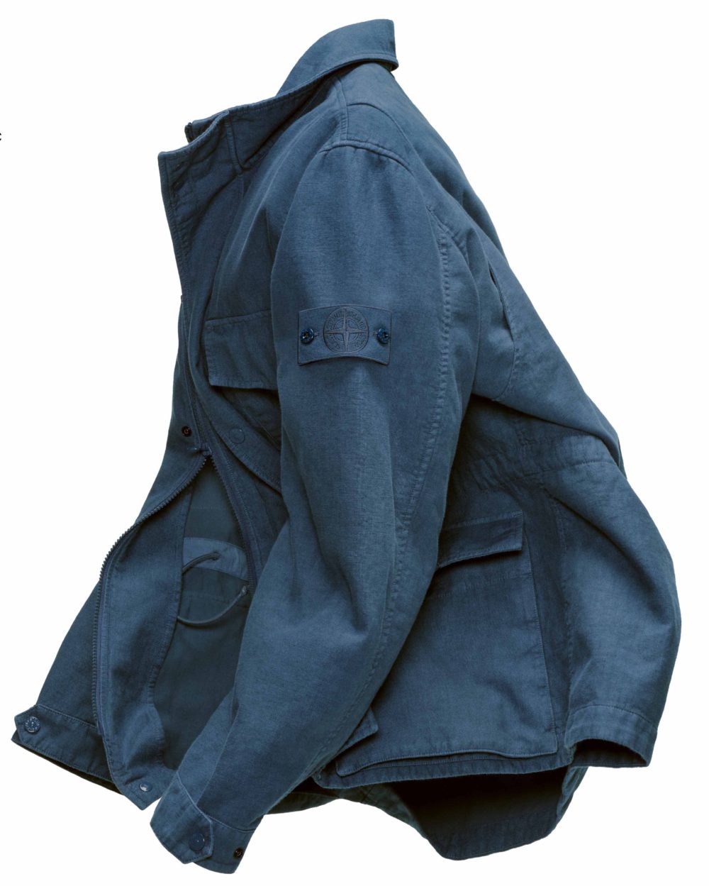 特殊なガーメントダイによる深みのある独特のブルーと陰影が、フィールドジャケット「Bonded Linen-TC」に唯一無二の雰囲気を与えている。同素材のパンツもラインナップされており、マルディーニ氏のようにセットアップで着用すると、リラックス感の中に余裕ある大人の品ある装いが完成する。左袖にはボディと同色のGHOSTバッジが付く。リネンフィールドジャケット¥286,000、パンツ¥88,000 both by Stone Island