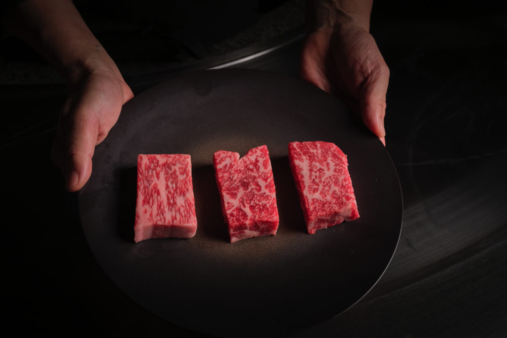 食べ比べをできるのは、400年の歴史を誇り、赤身と脂の絶妙な調和が生み出す上品で奥深い旨みが特徴の「近江牛」、きめ細やかな肉質と口の中でとろけるようなコクのある「松阪牛」、そして繊細な甘みと美しい霜降りがありながら、赤みの旨みも感じられ、軽やかな後味を残す「神戸牛」。それぞれ50グラムずつ堪能できるため、合計150グラムのお肉を堪能できる非常に満足度の高いコースだ。