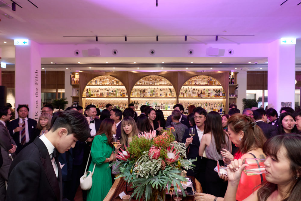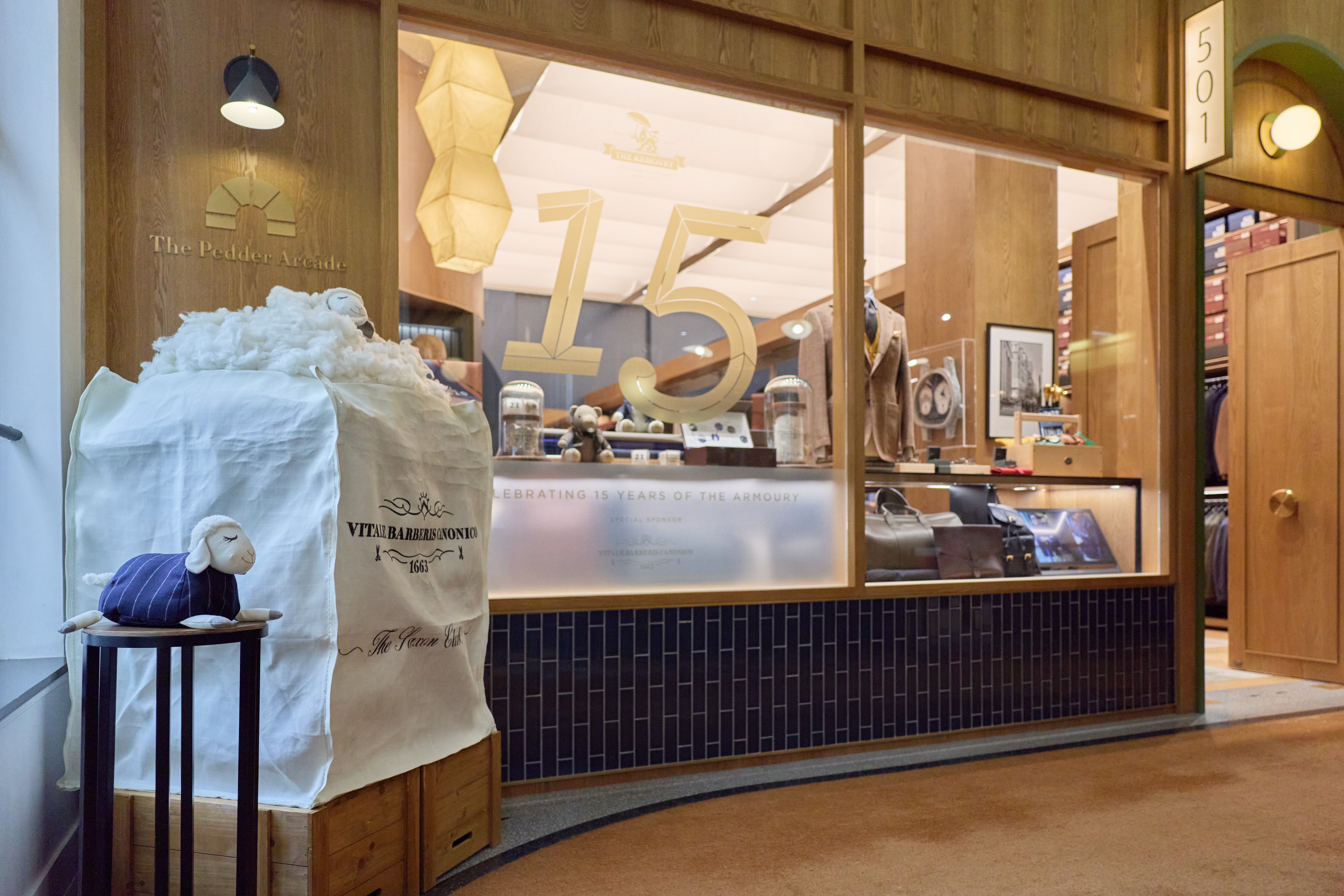 アーモリーのストアが位置する会場のペダーアーケードは15周年を祝う人々で熱気に包まれた。アーケードには写真のバースペースに加え、フィリップスオークションハウス、ウィスキーライブラリー、金子眼鏡店、アーモリーのシガーラウンジ「スタディ」等を備える。