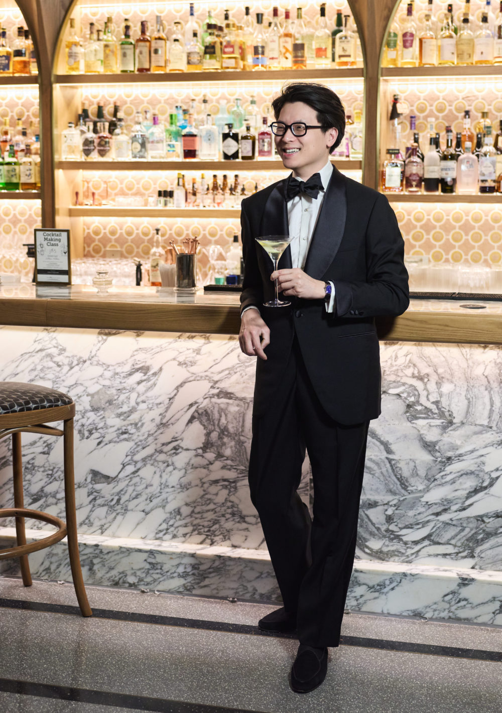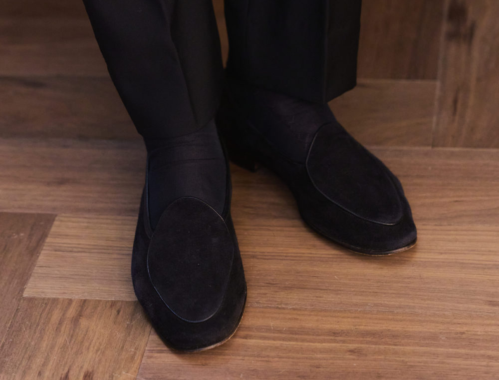 ナイトスタイル:テーラーケイド製ビスポークタキシード、アスコット・チャン製シルクシャツ。ベルネロンの時計「ミラージュ 34」とボードイン&ランジ製スエードサガンスリッパースで外しが効いた洒脱なスタイルに。