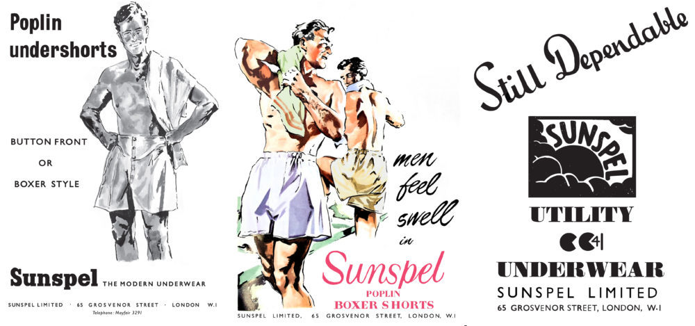 サンスペルのボクサーショーツの広告(1942年、1949年、1956年より)。