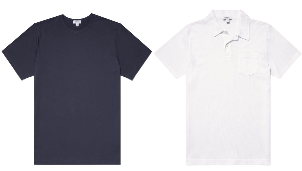 サンスペルの定番商品。最高品質のスーピマコットン製、各色あり。左:クラシックTシャツ ¥16,830 右:リヴィエラ・ポロシャツ ¥25,080 both by Sunspel