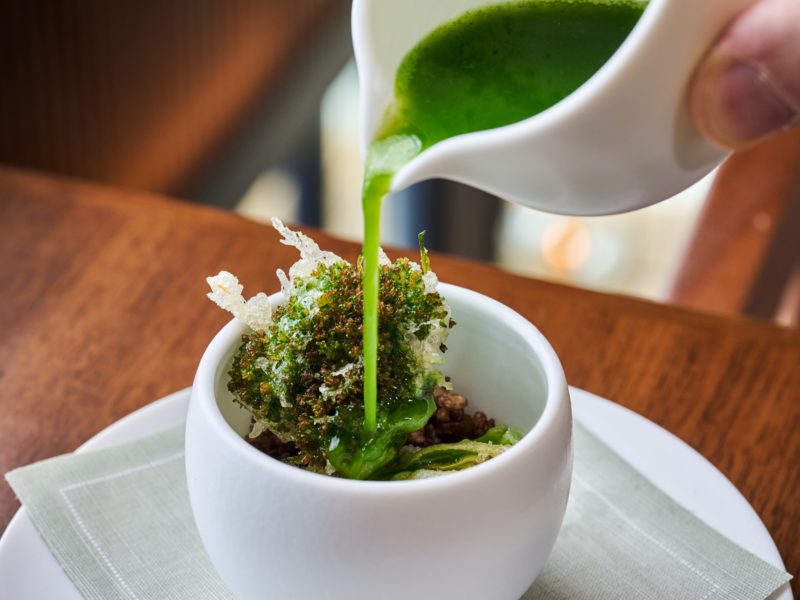 ひと皿目のメニューは「蕗の薹 ケール いろいろ米」。50種類以上ある栃木県産の米から何種類かをブレンドしカリカリに炒めたものに、ケールやふきのとうのかき揚げをのせ、仕上げにケールとチキンコンソメのソースをかけた、鮮やかな緑が印象的なメニュー。今回から、villa aidaで使っている器と同じMORIYAMAの白い器に統一された。乾杯は、「Telmont ʻReserve Roseʼ(テルモン レぜルヴ ロゼ) 2019」のシャンパーニュで。
