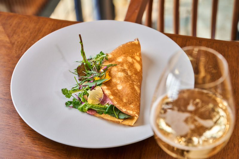 ふた皿目は「燻製頂鱒 季節野菜」。ほんのりと甘いクレープ生地で、日光のブランドニジマス「頂鱒(イタダキマス)」と、さまざまな種類の野菜の葉や根、花を包むことで、苦みのある生野菜なども食べやすい彩り豊かなサラダ。「Coco Farm & Winery “Pinot Rose”2022(ココファームワイナリー ピノロゼ)」のピノノワールとともに。