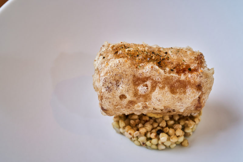 4皿目は「人参 蕎麦」。茹でたてのそばの実を下に、クリームチーズ、カリカリにしたそばの実をトッピングしており、そばの衣をまとわせて揚げた人参が堂々と鎮座。最後にスープドポワソンのソースをかけることで香りが立ち上る。スープに使う魚はホテルで使った魚のカマなど料理にはならないが良い出汁がとれるサステナビリティフィッシュを使用。「Ausonia “Machaon” Pecorino Colli Aprutini」(オーソニア マカオン ペコリーノ コッリ・アプルティーニ)2021」のイタリアワインとともに。