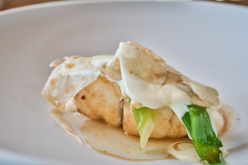 5皿目は「サステナブルフィッシュ 葱 根セロリ」。魚の種類を指定せず、その日その時に美味しい魚を使うことでフードロスを減らすメニュー。訪れた日は旬の鯛やイトヨリダイが入荷していた。根セロリ、葱、白ワインとレモンのコンフィを添え、フレッシュチーズに辛子を効かせたソースと焦がしバターをかけた、葱を味わう一皿。ペアリングは「Pascal Jolivet Sancerre(パスカル・ジョリヴェ サンセール)2022」ソーヴィニヨン ブラン。