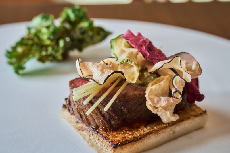 6皿目の「とちぎ霧降高原牛 大根 干し野菜」。大根ステーキの上に柔らかくジューシーなとちぎ霧降高原牛をのせ、隠し味の日光梅太郎みそとプチヴェールフリットをトップに飾っている。重ねて盛り付けたレイヤーが美しい、大根を美味しく食べるための一品。イタリアの赤ワイン「Bressan Pinot Nero(ブレッサン ピノ ネロ)2015」のピノノワールとともに。