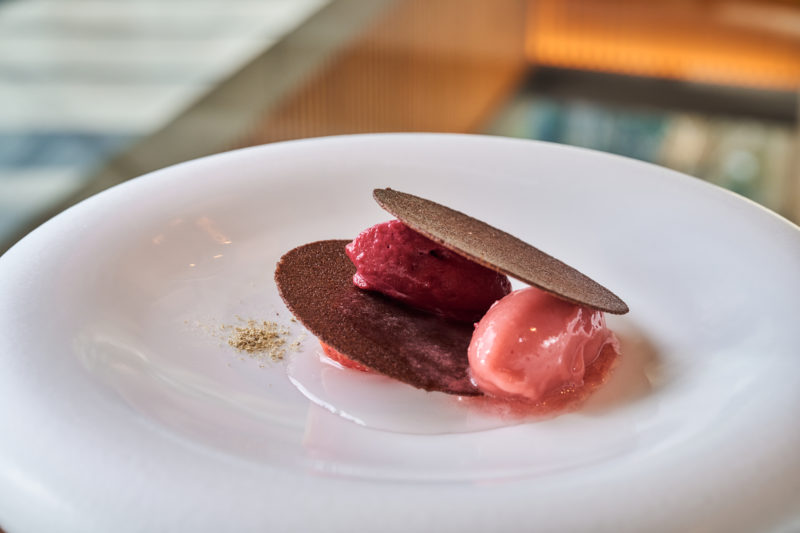 最後は「いちご ビーツ チョコレート」。いちごを他の食材と組み合わせることで、その味わいをさらに際立たせるデザート。今となっては稀少品種の甘酸っぱい女峰をあえて使用したいちごジェラートと、ビーツのジェラート、チョコレート風味のチュイルを合わせ、ローズマリーシロップとカモミールパウダーの香りで調和させた逸品。