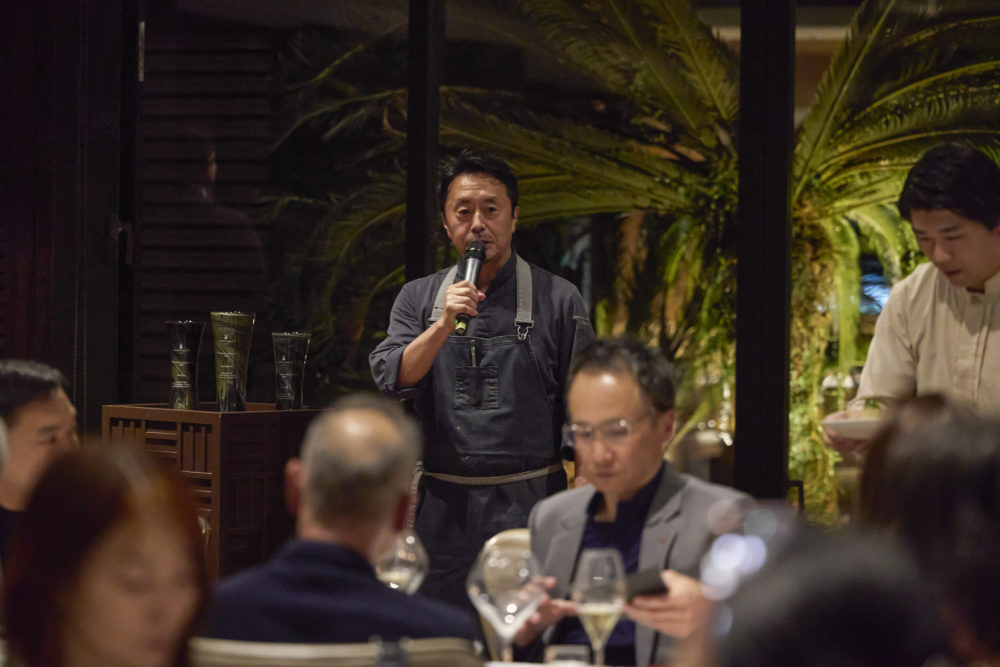 コンペティションを終えた夜は、待望のスペシャルガラディナーへ。今回招かれたのは、完全予約制のカウンターのみでガストロノミーを提供する「Mauvaise herbe(モヴェズ エルブ)」の小島圭史シェフだ。塩をなるべく使用せず、沖縄産のハーブや薬草、害獣、未利用魚など地域ならではの食材を生かしながら、イノベーティブなフレンチの手法で注目を集める存在。住所非公開というスタイルも相まって、“予約の取れないレストラン”としても話題を呼んでいる。